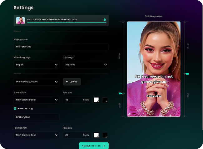 Set clip length, fonts, colors, and hashtags; export the perfect format for every platform.